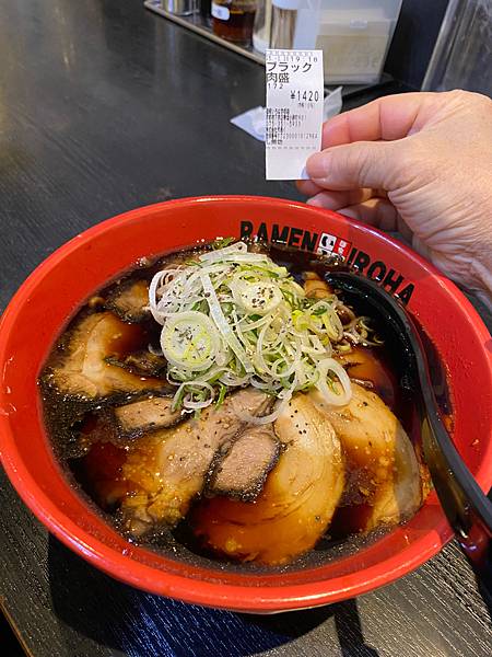 哇,真的是黑麻麻,肉多,1400丹( 304台幣),1940年代,日本經濟不好,富山黑拉麵為了補充勞動階級流失的鹽分,做出醬油拉麵,廣受一般民眾喜愛,入鄉隨俗,吃吧,肉軟嫩夠味,麵也吸飽湯汁,搭配大量的蔥花味道很好。